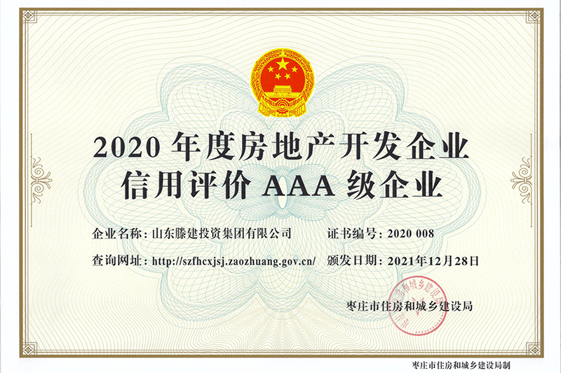 近期,枣庄市住房和城乡建设局发布了2020年度全市房地产开发企业信用等级评定结果。韦德官方网站有限公司凭借在企业客观信用能力、经营信用情况、社会信用等方面出色的综合实力,荣获2020年AAA级房地产开发企业最高信用等级。房地产开发企业信用评定是枣庄市住房和城乡建设局依据《枣庄市房地产开发企业信用评价实施细则