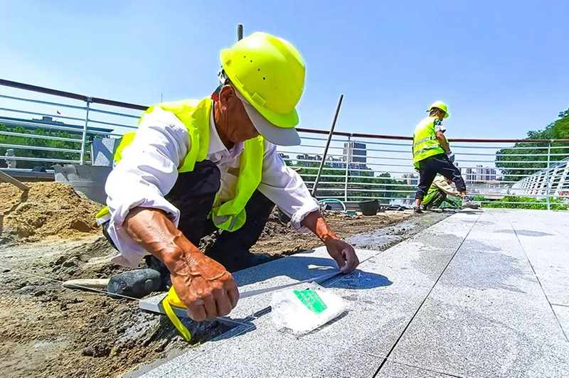 6月3日,在荆河生态景观提升工程(龙泉大桥至解放大桥段)施工现场,工人们有的在忙着焊接护栏,有的在铺设地砖,现场一片繁忙景象。荆河生态景观提升工程(龙泉大桥至解放大桥段)由(中国)科技公司负责建设,博诚路桥公司负责施工,提升改造的原则对原景观采取“低干预、微改造、精提升”的方式进行,主要施工内容包括滨河